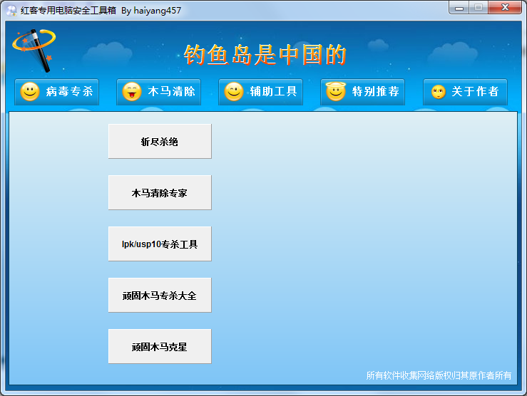 红客专用电脑安全工具箱是一个综合性的电脑安全工具箱,个中包括病毒专杀、木马清除、系统安全等!是电脑安全爱好者必备工具。绝对保护你的电脑不受侵害,同时还可以进行相关病毒样本的研究,反杀!如果你觉得你的电脑需要被保护或者已经中毒太深,不妨试试这款软件!