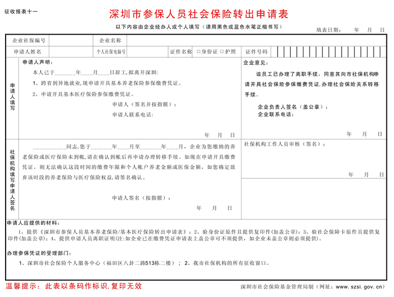 深圳市参保人员社会保险转出申请表预览图
