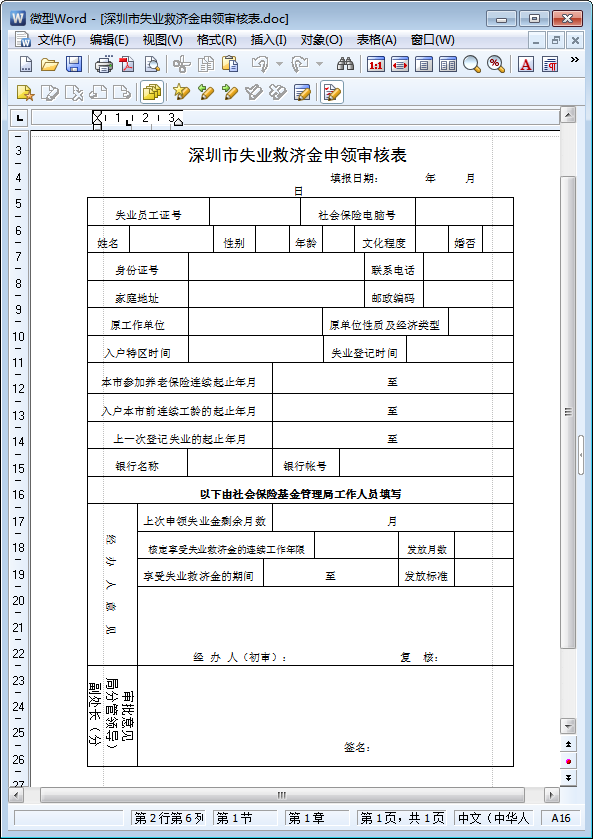 深圳市失业救济金申领审核表预览表