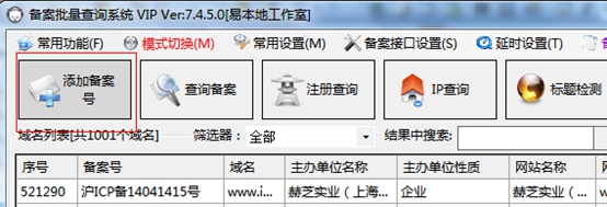 易本地备案批量查询系统是一款功能非常强大的网站域名、网站标题等等网站信息查询软件,它是采用工信部的实时数据,保证查询的准确性,东坡带来是易本地备案批量查询系统绿色免费版,是目录互联网上效果最好,速度最快的批量查询工具!