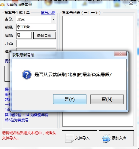 5. 选择省份后,软件会弹出“获取最新号段”对话框,选择是,软件会自动从服务器获取当前最新下发的备案号段,如果需要扫描当天最新的备案号,请选择“是”