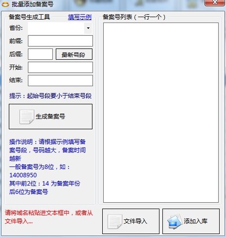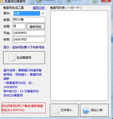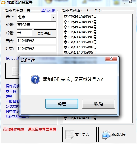 6. 生成后,列表出现备案号段信息,点击添加入库,新的备案号段添加进的待查询列表中,不继续导入,点击“否”