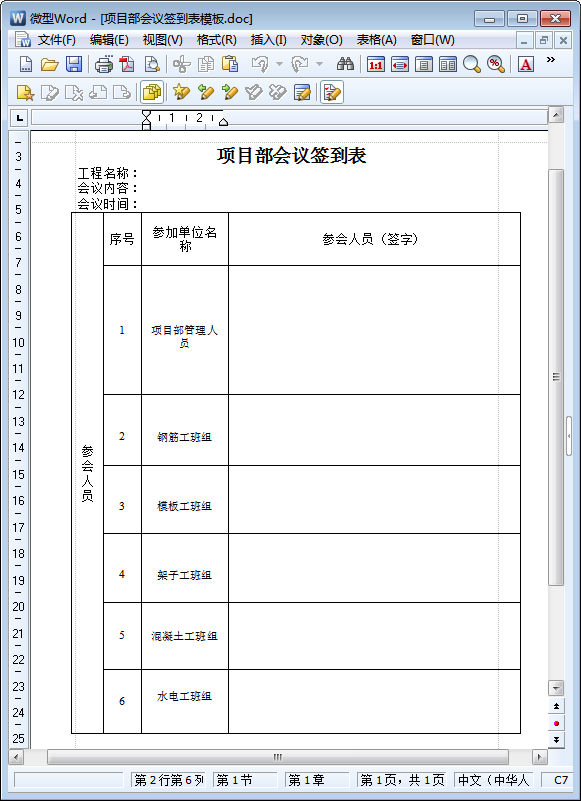 会议签到表模板可供建筑工程项目部在召开会议时作为签到表使用。该表格内容包含有工程名称、会议内容、会议时间、参会人员、项目部管理人员等,下文中有关于该建筑工程项目部会议签到表模板的介绍,欢迎有需要的朋友前来下载使用该表格!