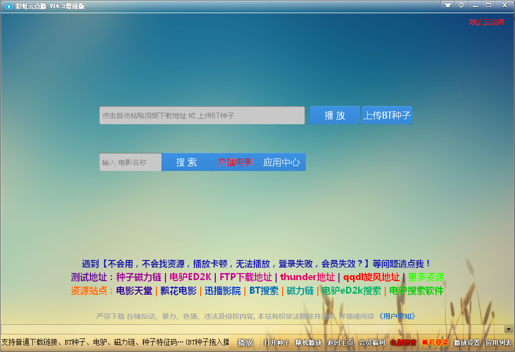 彩虹云点播是什么软件,大家应该都懂的吧!这里,小编为大家带来最新彩虹云点播14.3增强版破解版,完美防和谐,解除一天一片播放限制,每天无限制播放,无需下载种子文件,只要输入磁力链,ed2k,magnet地址即可播放,可拖动!
