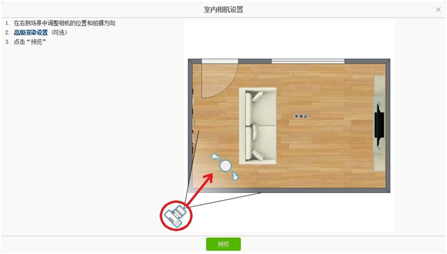5、待3D视图下调整完成之后,先对设计方案进行保存,然后点击软件右下角“室内效果”按钮,并选择添加相机;之后会弹出效果图取景窗口。将相机拖放至房间的平面图内,旋转好取景角度,点击“预览”即可生成效果草图。