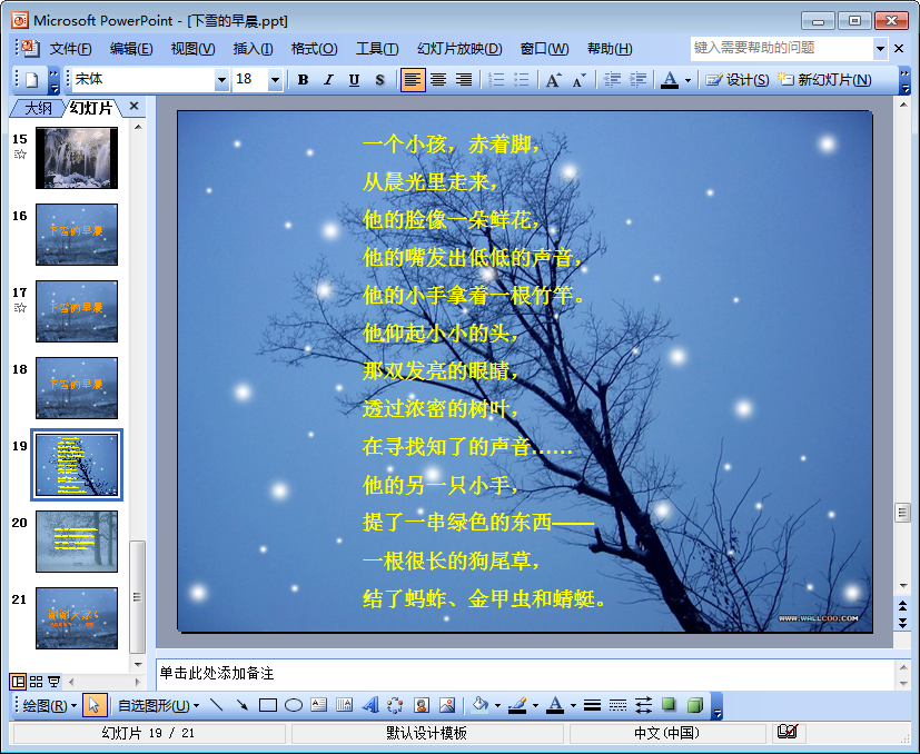 小编在这里为大家介绍的下雪的早晨课文其实是一篇经常出现在小学语文课本中的诗歌,那么如何引导学生来学习这篇诗歌、理解作者在其中要表达的思想感情呢?本节内容东坡小编为大家整理带来的是一份共由21页组成的免费版下雪的早晨ppt精品课件,该ppt课件以图片为主,有需要的朋友的点击本文相应的下载地址进行下载即可查阅该ppt的全部内容哦!