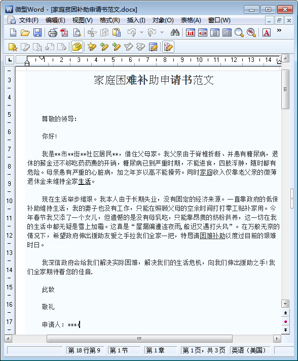 该word免费版家庭贫困补助申请书参考范文文档中共包含有三份家庭贫困补助申请书,分别为家庭困难补助申请书范文、生活困难补助申请书、困难职工申请书,家庭贫困补助申请书以真实情况为准,应依据个人实际情况而写,小编为大家整理打来的这份家庭贫困补助申请书参考范文仅供大家参考,有需要的朋友点击本文相应的下载地址进行下载即可!
