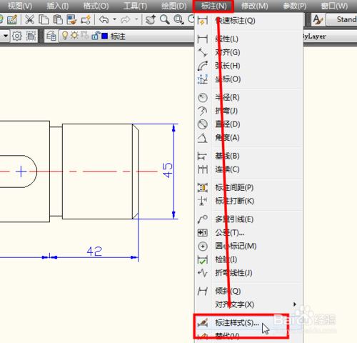 这时,只需在菜单工具栏上选择“标注”这一选项,单击,在下拉栏中选中“标注样式”: