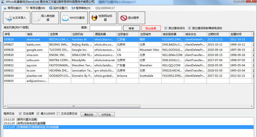 1、批量查询域名WHOIS信息(包括注册商,域名服务器,注册状态,注册时间,过期时间,更新时间)
