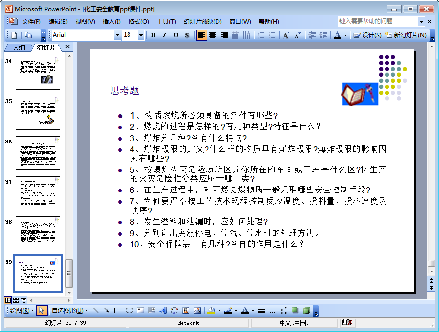 这是一份主题为化工生产的防火防爆的化工安全教育ppt课件,该ppt详细介绍了化工安全知识,适合作为化工安全培训ppt使用。该化工安全教育ppt课件共39页,内容免费,有需要的朋友点击本文相应的下载地址即可查阅该化工安全教育ppt课件的全部内容,以下是关于该ppt的相关内容介绍,希望对大家有所帮助!
