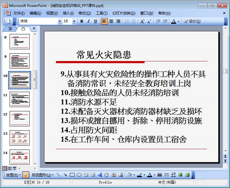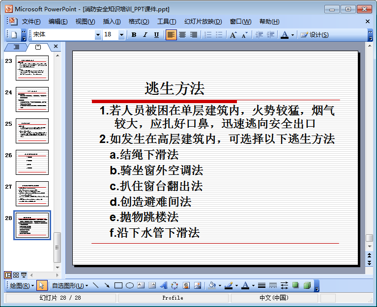 这是一份十分适合作为消防安全知识培训使用的ppt课件,该ppt课件共有28页,内容完整免费,主要围绕燃烧三要素、燃烧的产物及危害、防火的基本措施、消防标志、火灾报警、灭火的基本方法、常用的消防器材及使用方法、火场逃生的原则及方法等方面展开,如果你需要了解更多的消防知识,如果你需要这份消防安全知识培训ppt课件,那就赶紧点击本文相应的下载地址来进行下载吧!