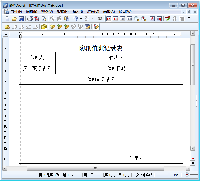 该doc格式word版防汛值班记录表由带班人、值班人、天气预报情况、值班日期、值班记录情况等项别构成,可直接作为防汛值班记录表使用。东坡小编建议,如果你需要一份值班表格模板或是需要一份防汛值班记录表进行打印使用,点击本文相应的下载地址下载这份防汛值班记录表模板就对了,以下有该表格的预览图,希望对大家有所帮助!