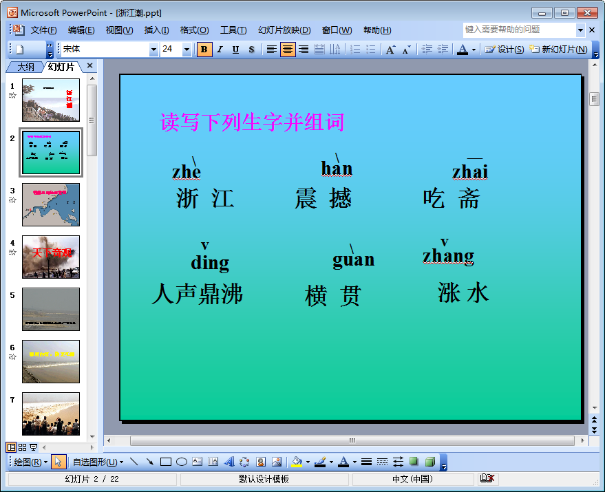 该浙江潮课文ppt共由22页组成,内容包括生字词讲解以及课文重难点语句讲解,是一份十分详细完整的ppt课件,以下是关于该ppt课件的内容摘要及预览图,如果你需要这份ppt课件进行教学使用的话,只需点击本文相应的下载地址进行下载即可!