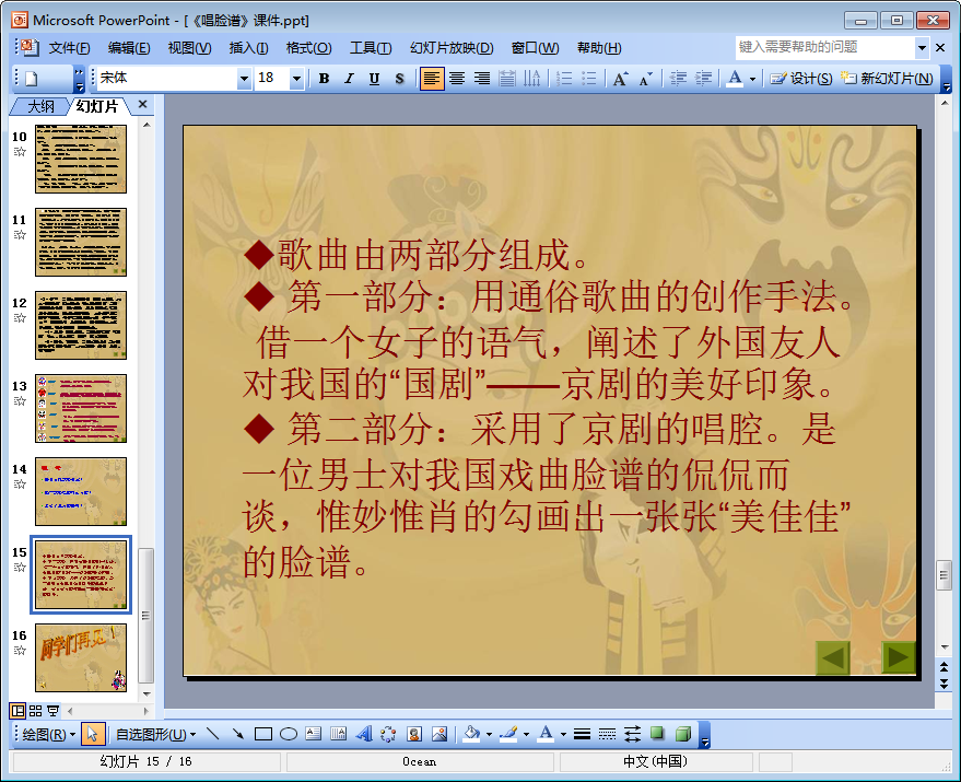 该唱脸谱课文ppt课件共由16页组成,ppt内容完整,图文并茂,适合小学阶段的学生理解唱脸谱一文的重难点知识,本文下方是关于该唱脸谱ppt的介绍,如果你需要一份内容完整的唱脸谱ppt作为教学课件的话,那就赶紧点击本文相应的下载地址将东坡小编为你整理带来的这份唱脸谱课文课件下载下来使用吧!相信它不会让你失望的哦!
