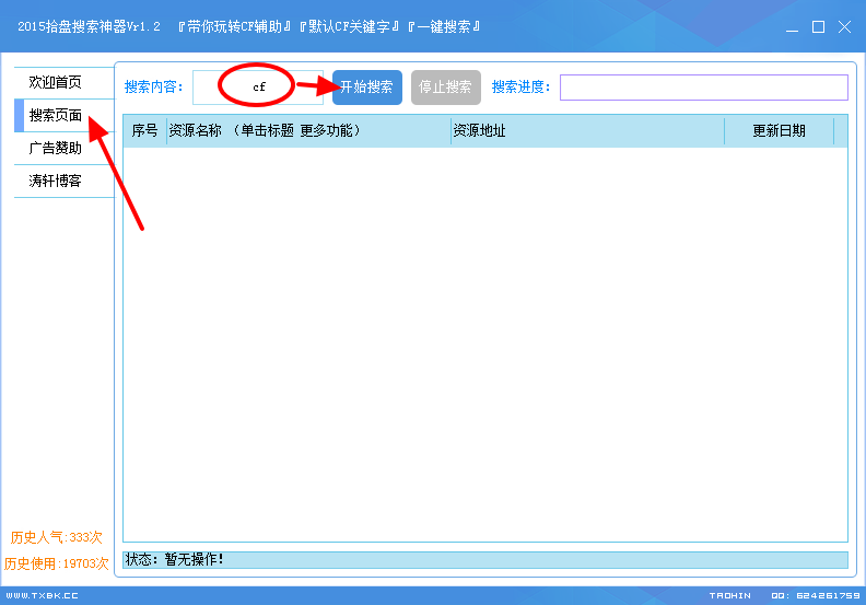 关闭杀软,运行拾盘搜索神器,在“搜索页面”内输入关键词,点击【开始搜索】,默认关键词是CF,如果你要单独找某款辅助的话就单独搜吧
