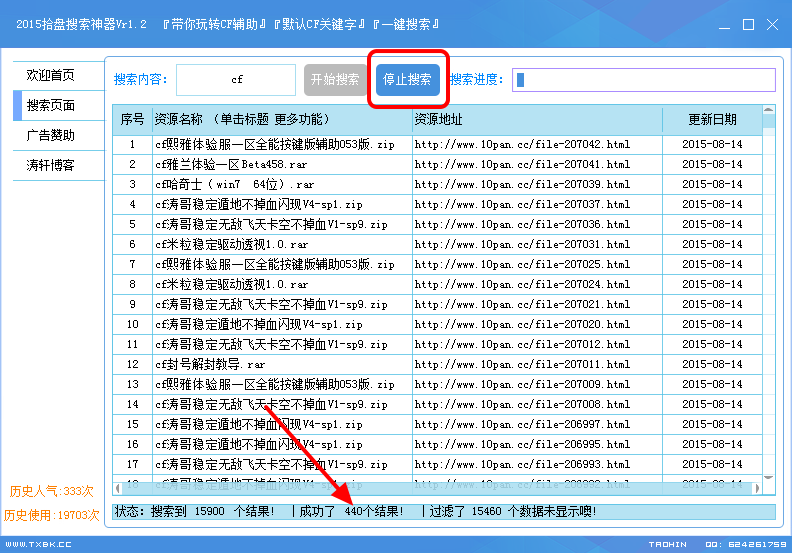 搜索结果:因为软件立马全部获取,数据量有点庞大,软件做不到瞬间完成,需要点时间。搜索到一定程度后,你可以点击【停止搜索】,因为后面的更新日期太久远了,辅助基本都不能用了