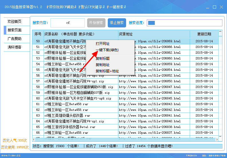 2015拾盘搜索神器是一款专业的CF辅助搜索下载器。拾盘是一款赚钱网盘,也是各路CF辅助作者最喜欢存放自己作品的网盘,每天在这里更新的CF辅助多达300-500款,不过也有发重复的,真正实际有效的100来款。还是非常不错的,欢迎下载!