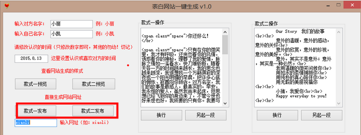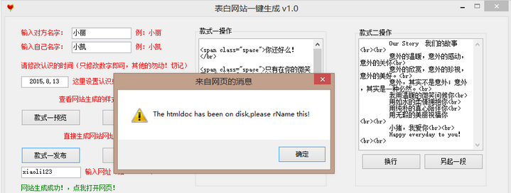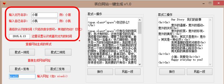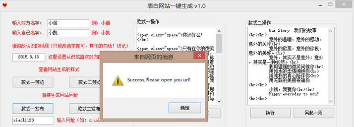 还有几天就到中国的最传统的节日七夕了,大家如果想要的表白成功的,就借助表白网站一键生成器,通过这个软件来增加你的成功几率,从而让你和喜欢的另一半度过美好的每一天!