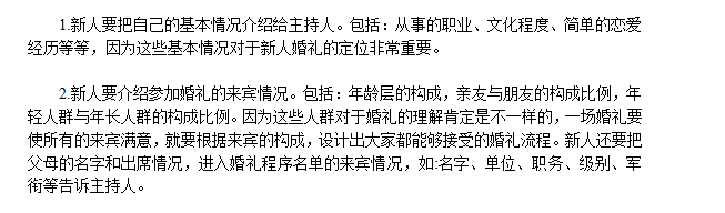 3.主持人要详细说明婚礼仪式中每一个环节的意义,及为配合每一个环节,新人在做动作时要注意什么,大概有几个说话的环节,可以说哪些方面的话。因为在结婚的当天,特别是在婚礼仪式开始入场前,新人一般都“心里没有底,脑子里一片空白”。所以,新人策划时一定要弄清楚这些细小的环节,在婚礼中才不会出错,也能够更好的配合照相师和摄像师的工作。