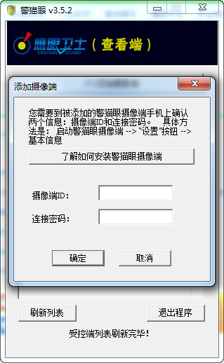 第二步,在另一台手机或电脑上运行“警猫眼”观看端程序,添加第一步的摄像端ID,即可连接。