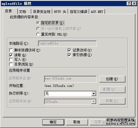 在应用程序池里有个"标识"选项,可以选择应用程序池的安全性帐户,默认才用网络服务这个帐户,大家就不要动它,能尽量以最低权限去运行大,隐患也就更小些。在一个站点的某些目录里,譬如这个"uploadfile"目录,不需要在里面运行asp程序或其他脚本的,就去掉这个目录的执行脚本程序权限,在"应用程序设置"的"执行权限"这里,默认的是"纯脚本",我们改成"无",这样就只能使用静态页面了。依次类推,大凡是不需要asp运行的目录,譬如数据库目录,图片目录等等里都可以这样做,这样主要是能避免在站点应用程序脚本出现bug的时候,譬如出现从前流行的upfile漏洞,而能够在一定程度上对漏洞有扼制的作用。