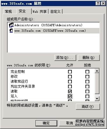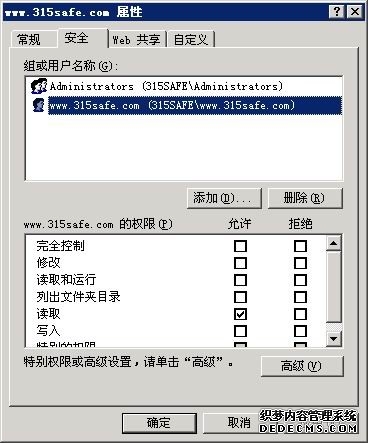 在默认情况下,我们一般给每个站点的web目录的权限为IIS用户的读取和写入,如图: