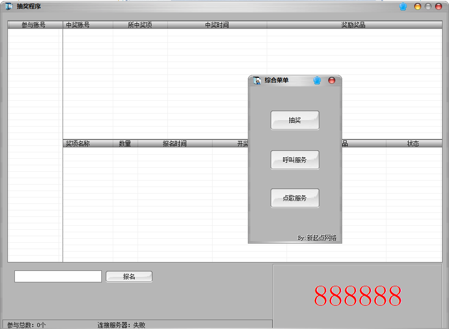 新起点网吧工具是一款网吧全方面应用软件,功能有呼叫网管,呼叫服务员,技术员等,同时带有抽奖系统,歌曲上传系统,网吧公告等。