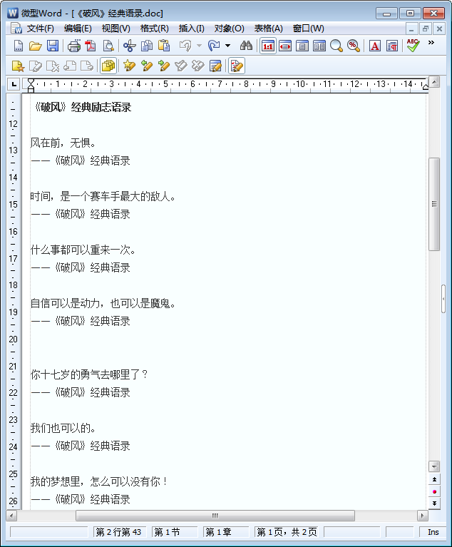 由林超贤导演、彭于晏、崔始源等主演的电影破风是一部非常值得一看的电影,它是一部体育电影,更是一部励志电影——不少朋友觉得其中的台词十分鼓舞人心,鉴于此,东坡小编便为大家搜罗整理了一些该电影中的经典台词语录,以下是该经典台词语录中的不妨内容介绍,如果你想要查阅该word免费版电影破风经典语录大全中的全部文字的话,点击本文相应的下载地址进行下载即可!