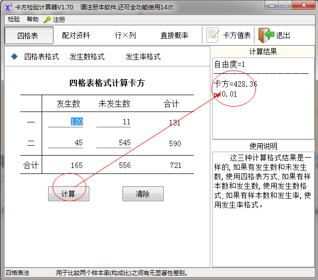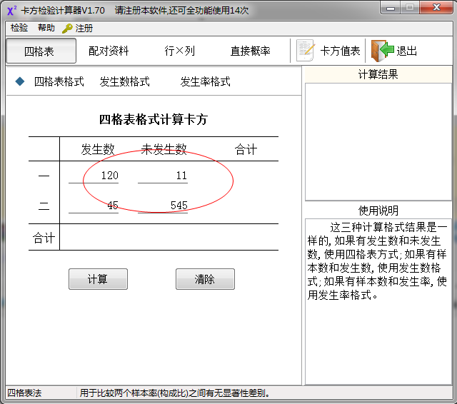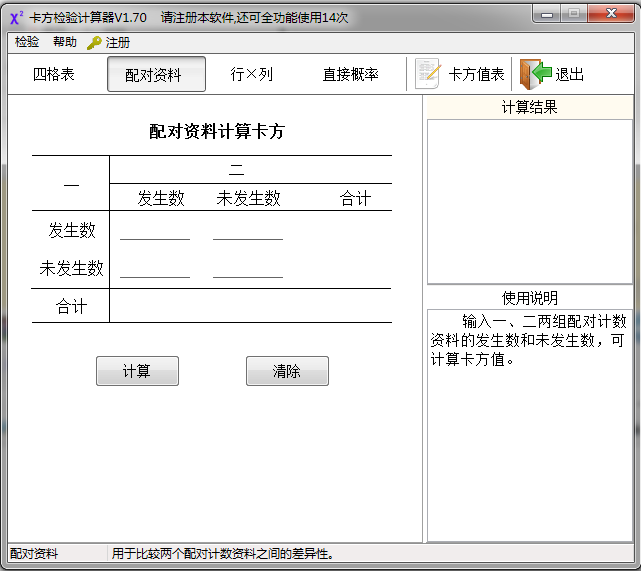 《卡方检验计算器》为共享软件,可自由复制传播,本软件只经过简单加密,请不要对本软件进行反编译、破解。未注册时有15次使用限制。注册后无功能和无次数限制,注册一次永久免费升级。