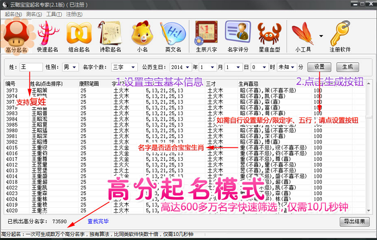 对一个人来说,起名不仅要有创意,更要符合命理。姓名不仅是代表一个人的符号,还记述着不同的文化观念,凝聚着父母深情厚意,表达着不同的理想抱负,情趣,爱好与目标追求。关系到人一生的事业、健康、官运、婚姻、财运、学业与人际关系等。一个好的名字,将跟随人一生,影响一生。云聪宝宝起名专家,根据八字五行缺失配合、取用天运五行相生、阴阳五格调和配置、配合生肖干支属性、整体形音义之吉凶,使每个父母都能帮宝宝起到称心如意的好名字。云聪宝宝起名专家,是我们花费了数年的时间收集资料,并咨询了大量的专家老师,字库均为人工一一核对,尽可能还原真实,结合宝宝的姓氏、性别、四柱八字、三才数理、生肖喜忌、天运五行、基础运、成功运、人际关系等诸多因素,由软件快速分析取得结果。相比人力的翻书查算,速度提高何止千百倍。整个软件编写时间超过一年,力求数据精准有效。软件内置600多万个好名字,除常见的五格起名之外,我们更在意宝宝的生辰八字,结合喜用神评分与生肖喜忌,真正为宝宝取得符合八字的好名字。此外,软件还内置了诸多趣味小工具,可以随意查询宝宝的星座血型、生日花、生日书、智商情商等,全方位360度的了解有关名字、生辰等的一切。因此,云聪宝宝起名专家之所以被称为起名专家,是因为软件无论从技术、算法、周易、历史文献知识上,均已经比当前99.9%的大师们更加专业,八字喜用神,生肖,五格三才等各方面,都无愧于专家的称号,必能给您的宝宝取到一个称心如意的好名字。