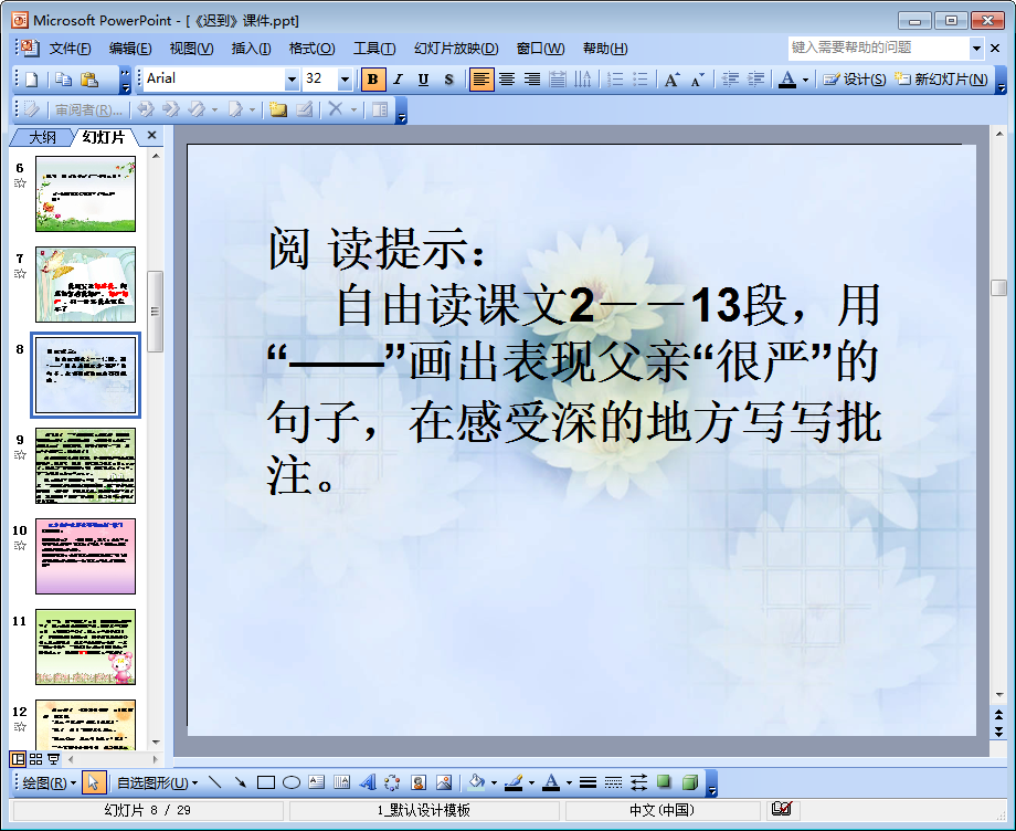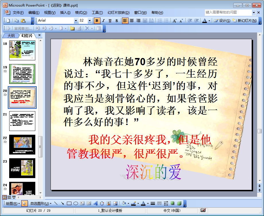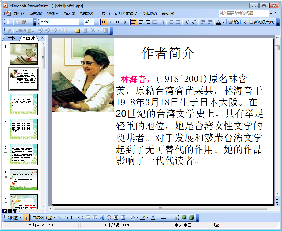 迟到作家林海音的文学作品之一,也是一篇被选在北师大版语文课本的课文。本节内容东坡小编为大家整理带来的是该课文的ppt课件,该ppt课件内容包含有作者简介、生字词教学引导、课文导读等部分,如果你需要这份由29页组成的北师大版迟到ppt课件的话,点击本文相应的下载地址进行下载即可!