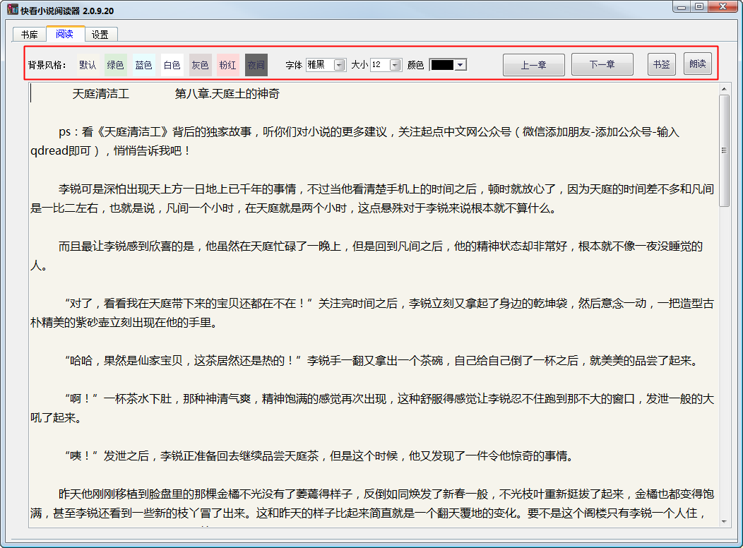 可以设置背景颜色,字体大小,颜色,天机书签,朗读