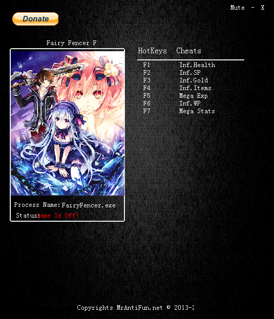 MrAntiFun版妖精剑士F七项修改器1.0应用于游戏1.0版本,有无限生命、无限SP等七项功能,让你可以轻松纵横游戏,需要的小伙伴自取。