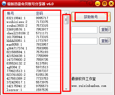 最新迅雷会员账号分享器(获取迅雷VIP账号)由最新软件工作室开发制作的免费共享软件,只需要一键点击“获取帐号”就可获得迅雷相关VIP免费帐号了,有需要的赶紧来东坡下载使用吧。