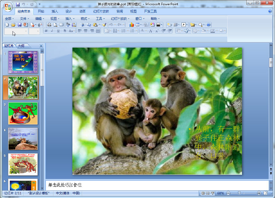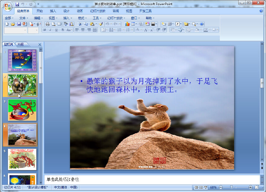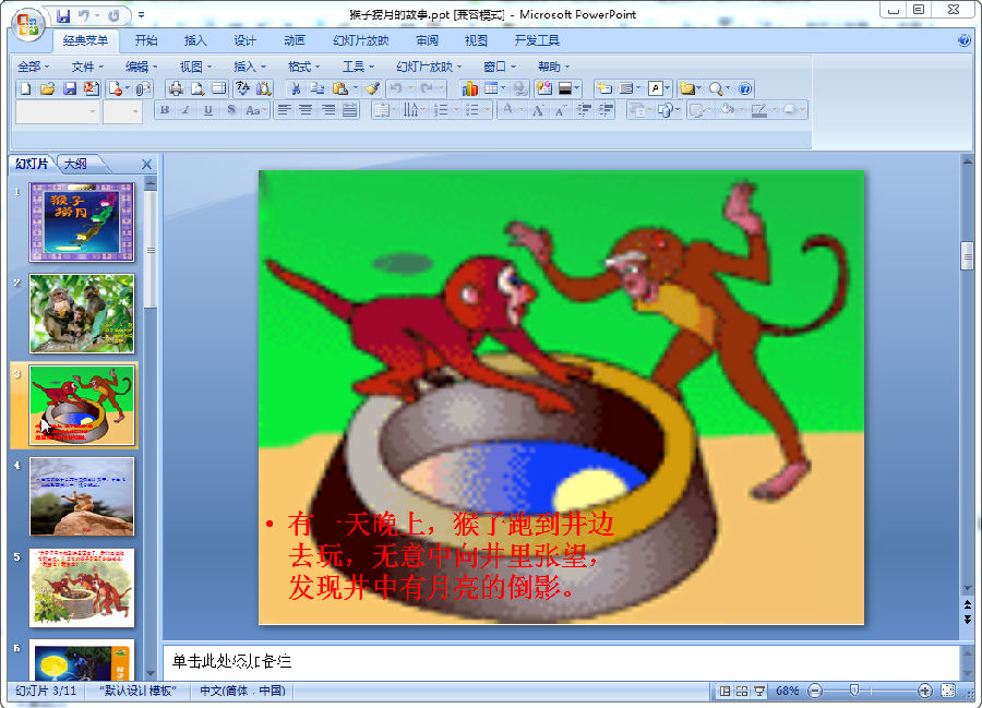 2.请幼儿欣赏《猴子捞月》故事PPT,分析理解故事内容。