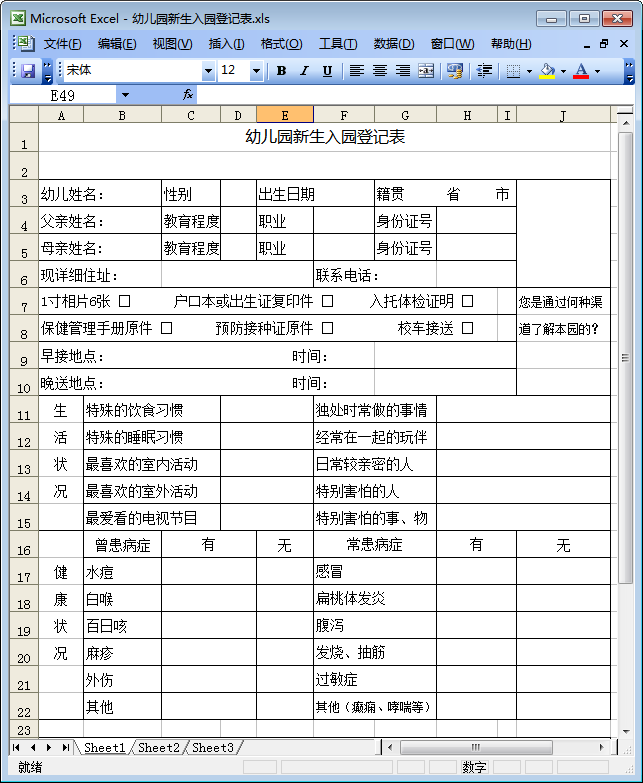 又是一年开学季,各大幼儿园又要迎来一群可爱的新朋友们啦!本节内容东坡小编为大家整理带来的是一份excel幼儿园新生入园登记表,供各大幼儿园记录新生基本情况进行使用。该表格为2015最新整理版,内容十分详细周全,包括幼儿父母基本情况登记,幼儿生活情况以及健康状况记录等,下文中有关于该表格的预览图,希望这份内容详细完整的幼儿园新生入园登记表能帮到你!