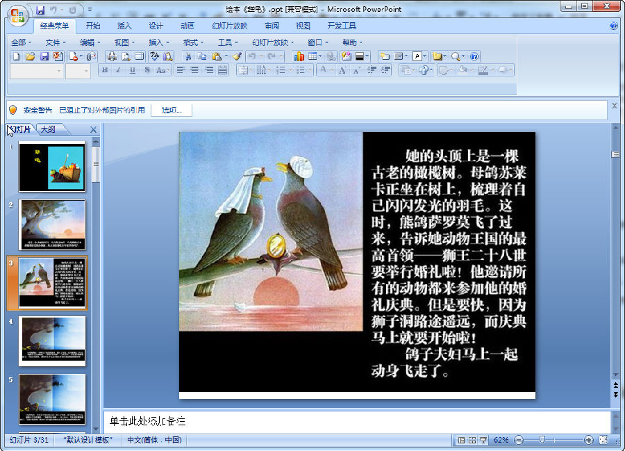 师:我一个人读没有意思,谁想读的举手,指名读“她的头顶上是一棵古老的橄榄树。母鸽苏莱卡正坐在书上,树立着自己闪闪发光的羽毛。这时,雄鸽洒落麽飞了过来,频频弯腰向母鸽致意,嘴里不停地叫道‘啊!苏莱卡,我的宝贝,你听说了吗?’”??略(指名学生演读故事片段一)