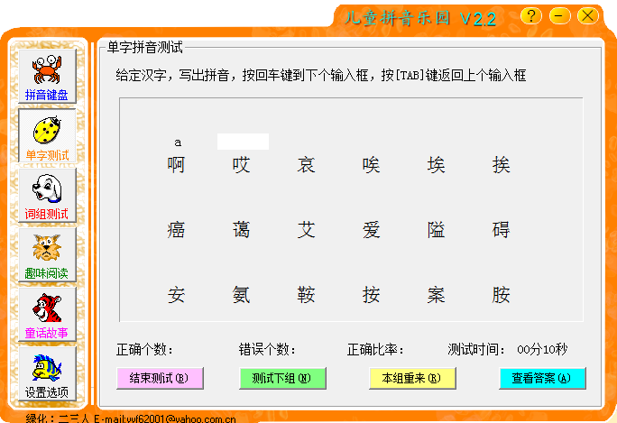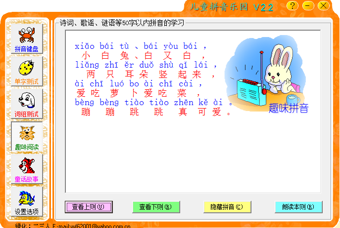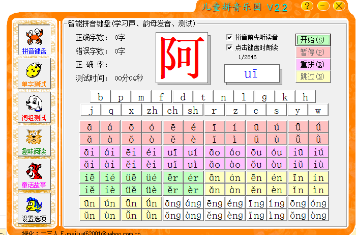 儿童拼音乐园软件是一款非常好用的汉语拼音学习软件,该软件创造性的将所有汉语拼音的声母和韵母组织成一个键盘分布图形式,每个拼音都有真正童音伴读功能,供初学者自由组织拼写和练习,并能让电脑智能朗读出所有由学习者自由组织出来的符合规范的字母组合拼音,软件根据学习者的学习规律,由浅入深、由易到难,从声母和韵母的组合拼写,到单字的拼写、词组、多音字、轻声字的拼写,再到整句、整篇的拼写1学习,并寓教与乐,使儿童在饶口令、背古诗、读歌谣、猜谜语和读童话的过程中,很快学会拼音的拼写规则,一步步掌握汉语的拼音规律!