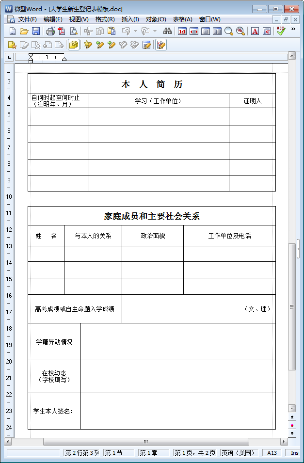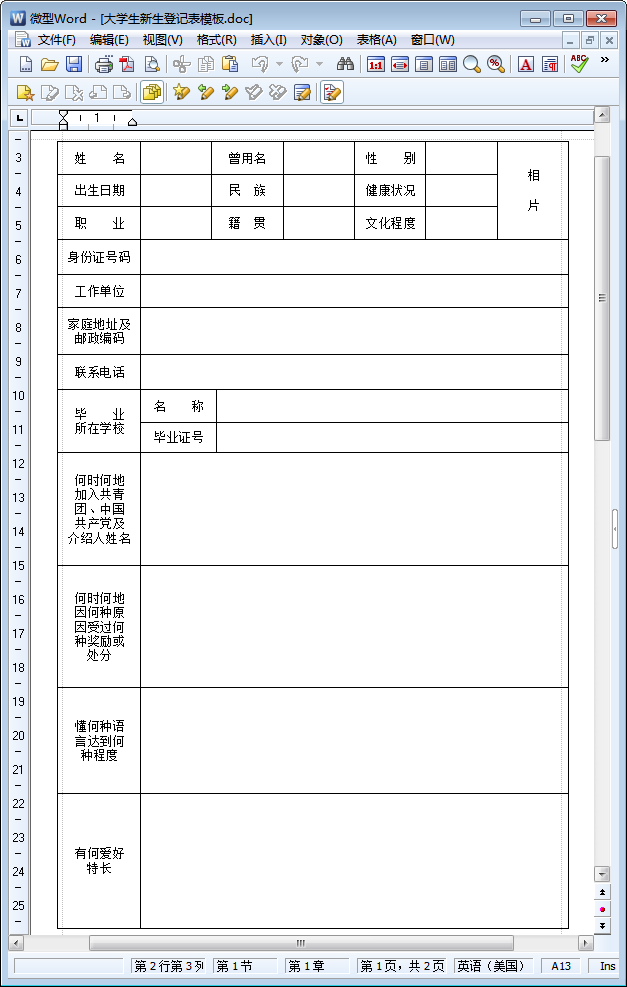 大学生新生登记表模板样表