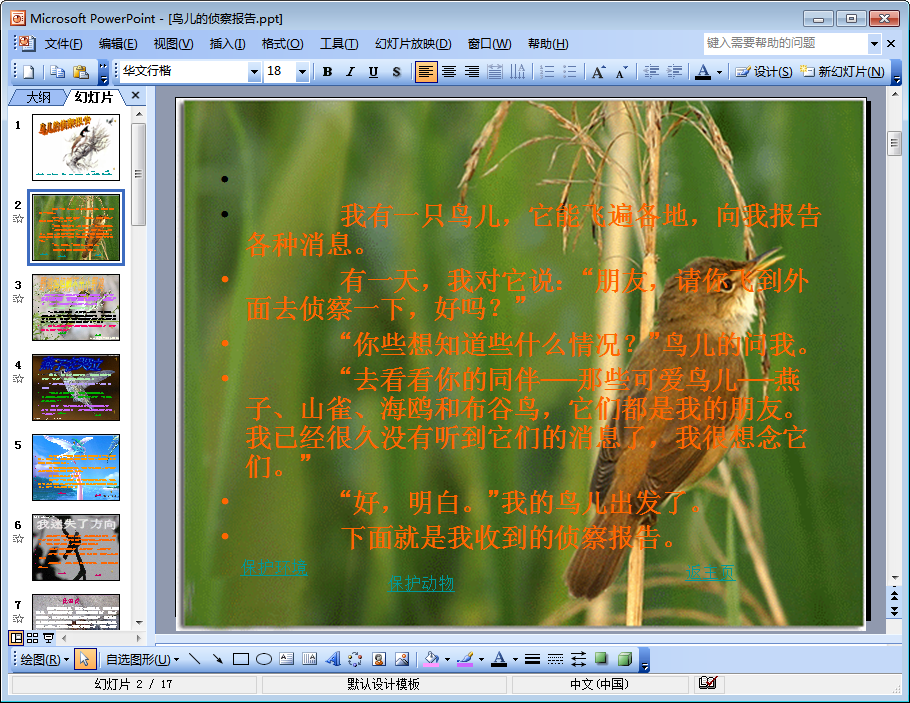 我有一只鸟儿,它能飞遍各地,向我报告各种消息。• 有一天,我对它说:“朋友,请你飞到外面去侦察一下,好吗?”• “你些想知道些什么情况?”鸟儿的问我。• “去看看你的同伴——那些可爱鸟儿——燕子、山雀、海鸥和布谷鸟,它们都是我的朋友。我已经很久没有听到它们的消息了,我很想念它们。”• “好,明白。”我的鸟儿出发了。• 下面就是我收到的侦察报告。