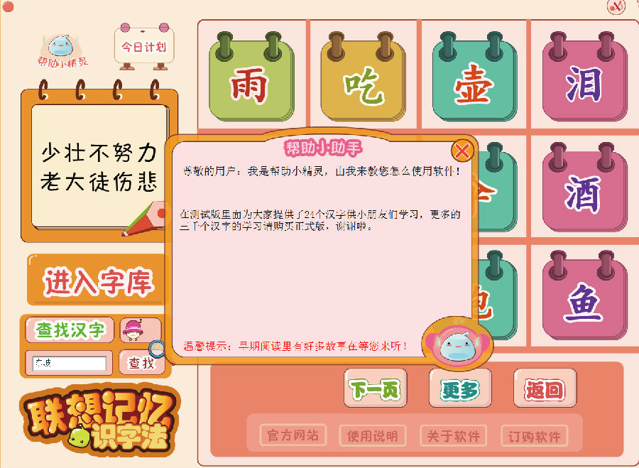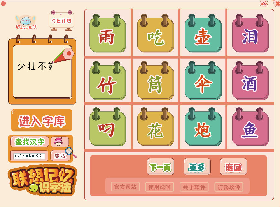 联想记忆识字法是一款针对2到10岁小朋友们准备的识字软件,软件通过将难懂的汉字变成一幅幅图画,一段段动画,让孩子们能通过右脑的快速记忆来达到识字的目地。