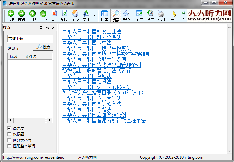 法律知识英汉对照是一款可以帮助你查询法律知识英汉对照工具,有需要进行对中国法律进行翻译的朋友,现在就可以来东坡免费的下载使用了!