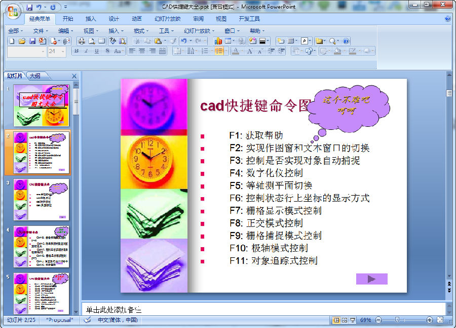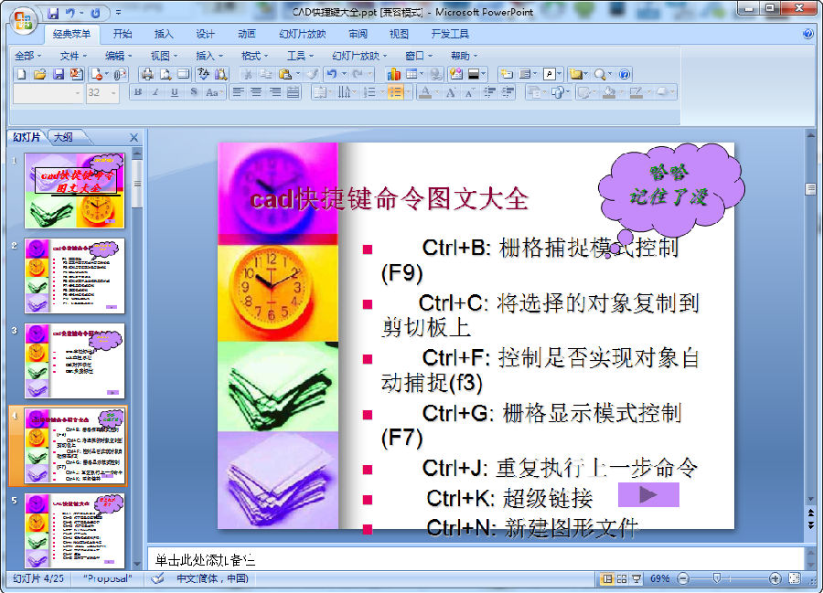 一款免费的cad快捷键命令图文大全。以图文的形式为你讲述,不让你看的时候觉得枯燥。让你快速、快乐地学习cad快捷键。而且是采用ppt的形式,还可以为他人做电子演示哦!使用cad的朋友千万不要错过哦!喜欢就来东坡下载使用吧!CAD常用的快捷键命令大全,主要包括快捷键命令的键盘操作和所对应的快捷命令,方便查找和使用,对cad初学者能够快速提高绘图速度。图文并茂,非常实用。