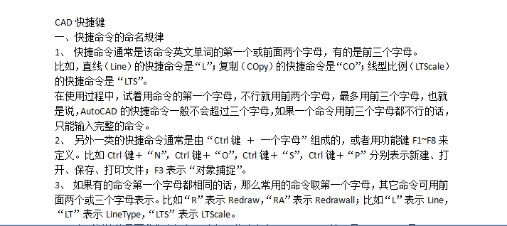 1、 快捷命令通常是该命令英文单词的第一个或前面两个字母,有的是前三个字母。 比如,直线(Line)的快捷命令是“L”;复制(COpy)的快捷命令是“CO”;线型比例(LTScale)的快捷命令是“LTS”。 在使用过程中,试着用命令的第一个字母,不行就用前两个字母,最多用前三个字母,也就是说,AutoCAD的快捷命令一般不会超过三个字母,如果一个命令用前三个字母都不行的话,只能输入完整的命令。
