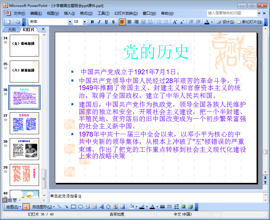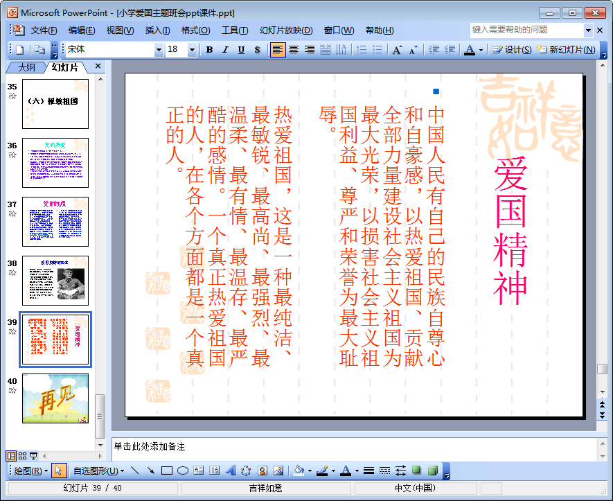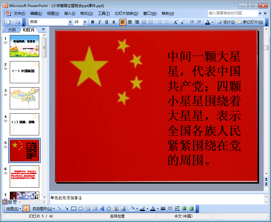 该小学爱国主题班会ppt课件共由40页组成,ppt内容图文并茂,是一份十分适合用来作为爱国主题班会课件使用的ppt,本文下方是关于该爱国主题班会ppt的内容节选及预览图介绍,想要查看该ppt更多内容的朋友们就快来东坡下载吧!