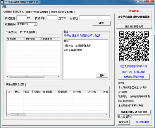 英乐快递费用计算器有两个大功能,第一个:快速的计算多个快递的费用,只需要输入重量,点下计算,即可。快递参数需要自己设置,可以从excel中批量导入。 第二个:淘宝网店快递模板的快速编辑,熟悉界面后1分钟可以操作完成,快来下载使用吧。