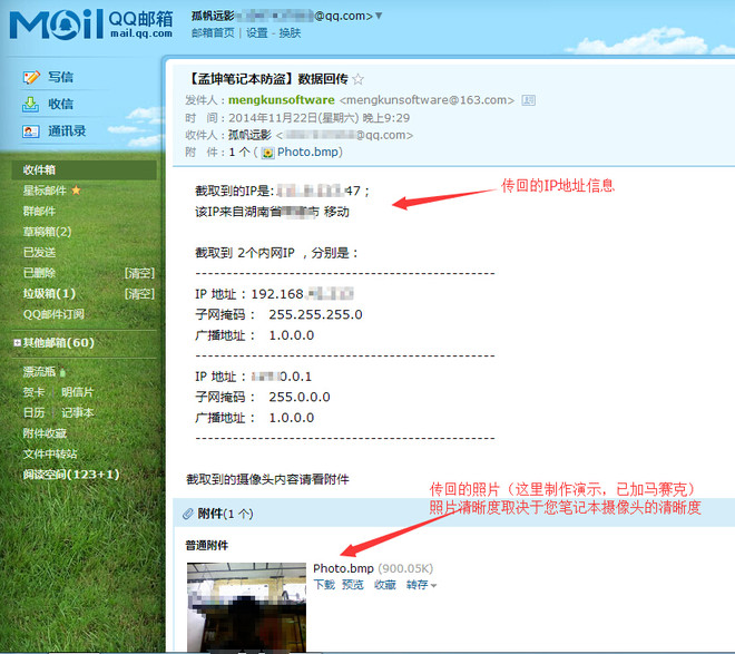孟坤笔记本就能自动通过被盗笔记本摄像头拍照并获取当前笔记本的IP地址发送到您设定的邮箱中(邮件发送频率为每半分钟发送一次),您只需要将邮件内容交给警方就行啦!
