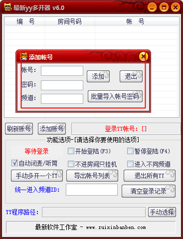 最新yy多开器是一款针对yy账号多开的最新辅助工具,这款最新yy多开器界面小巧、功能强大,能够帮助用户在同一台电脑进行多个yy账号多开操作,快速提升yy频道人气。