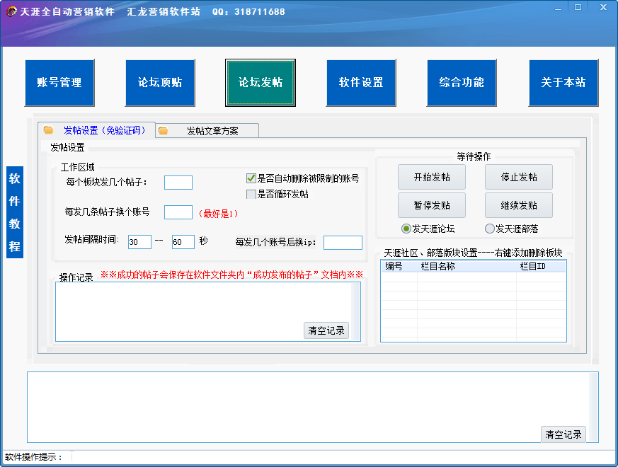 天涯论坛用户量庞大,帖子很快就会沉下去,这就需要用到我们这款天涯论坛营销助手软件,可以让您的帖子一直保持在版块的前几名,获取大量浏览量和点击率,是推广产品,打造影响力的不二选择!