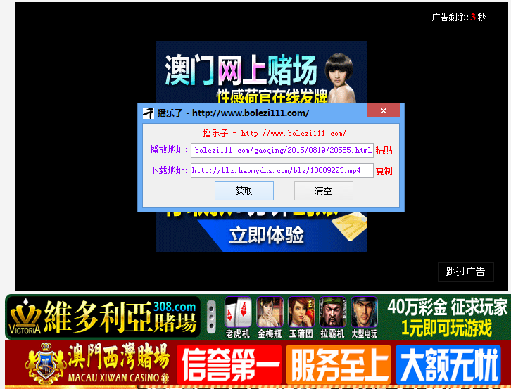 软件登陆成功后,打开你需要下载的播乐子视频地址,粘贴到软件“播放地址”编辑框中,然后点击【获取】按钮即可,将获取到的视频地址复制到浏览器或者相关相关下载器中,即可下载。